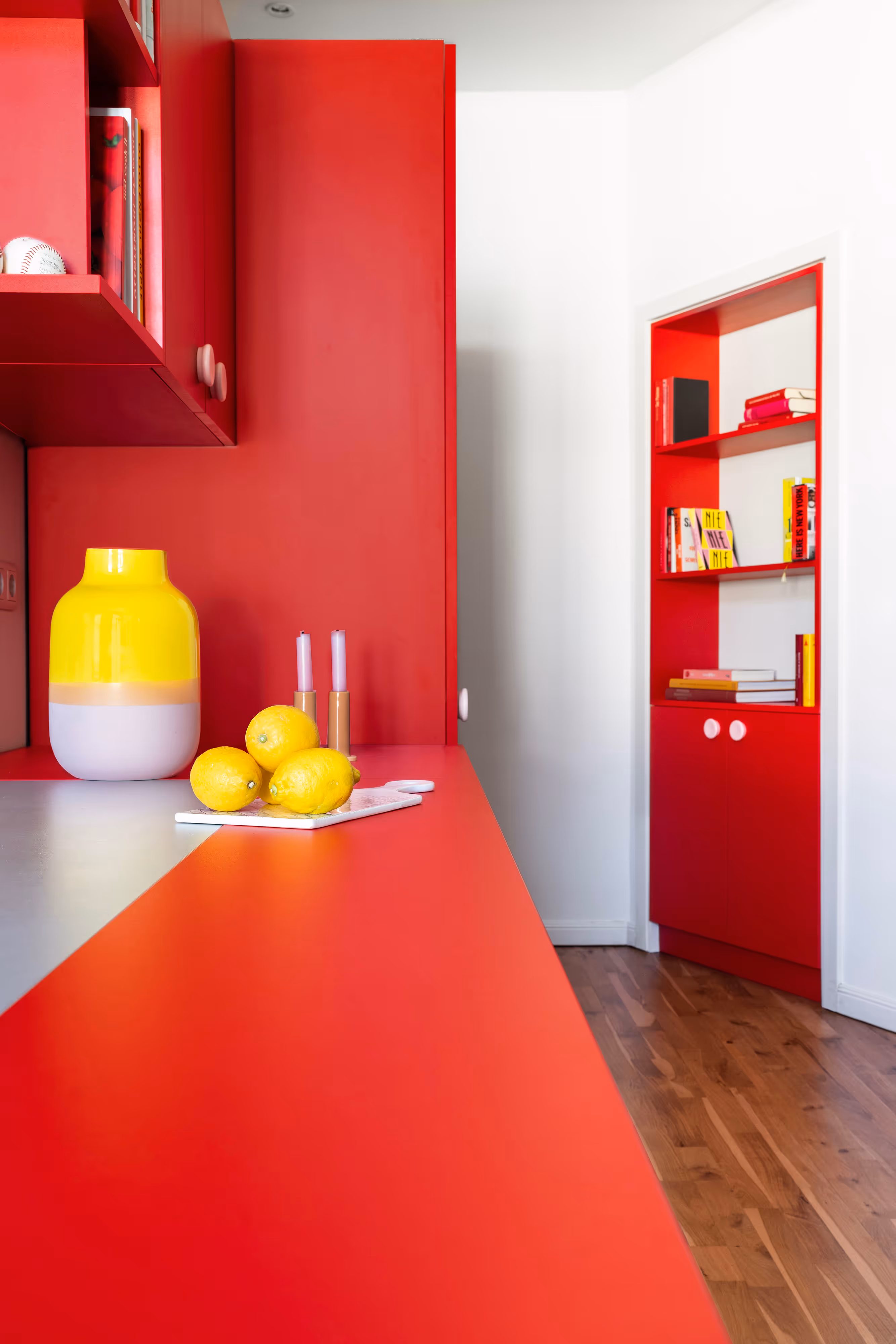 In the entrance and the dining room, we have designed several pieces of library furniture in harmony with the red cube of the kitchen, to connect the different functions of the space, and to host the numerous books present in the apartment.