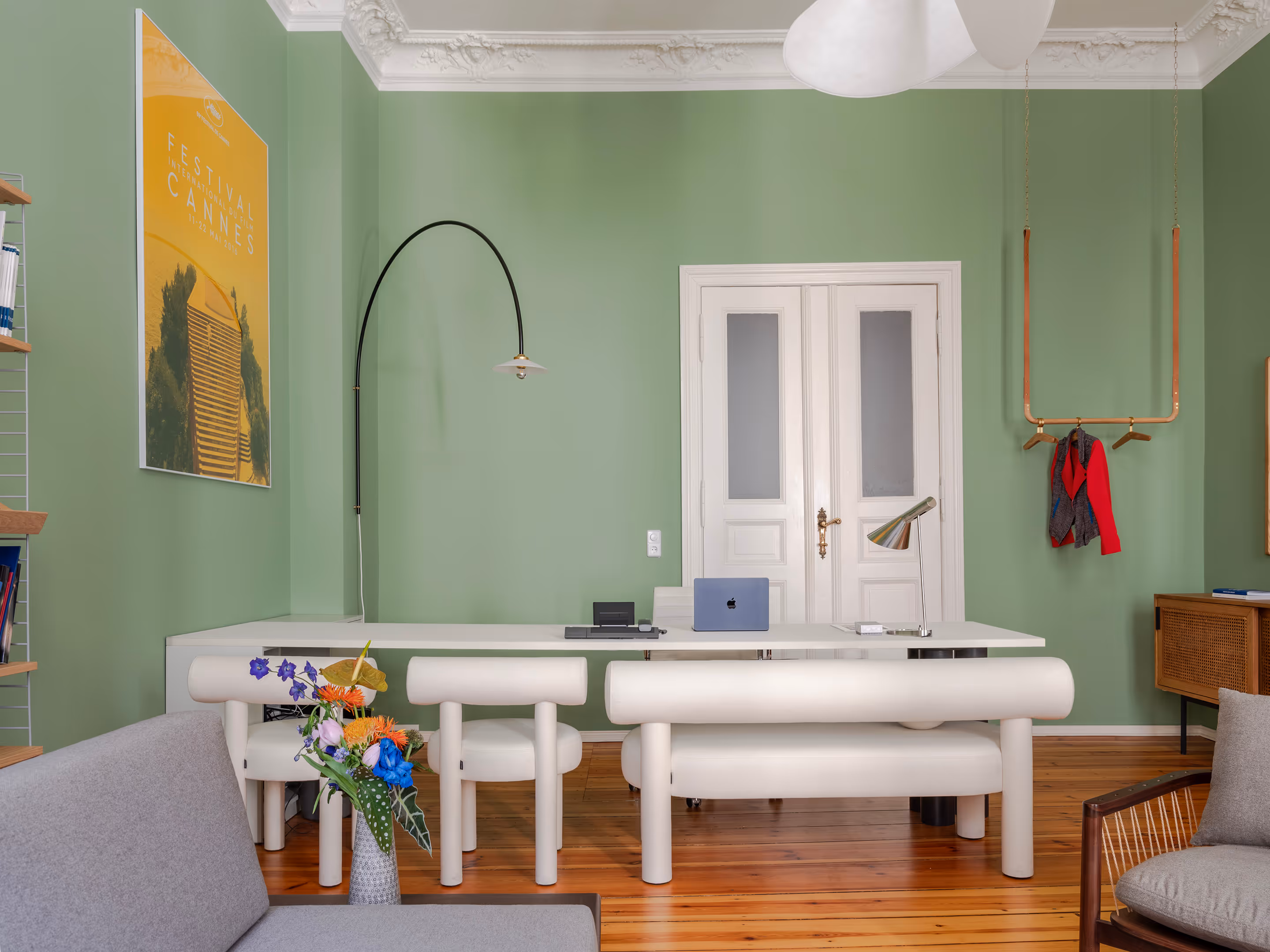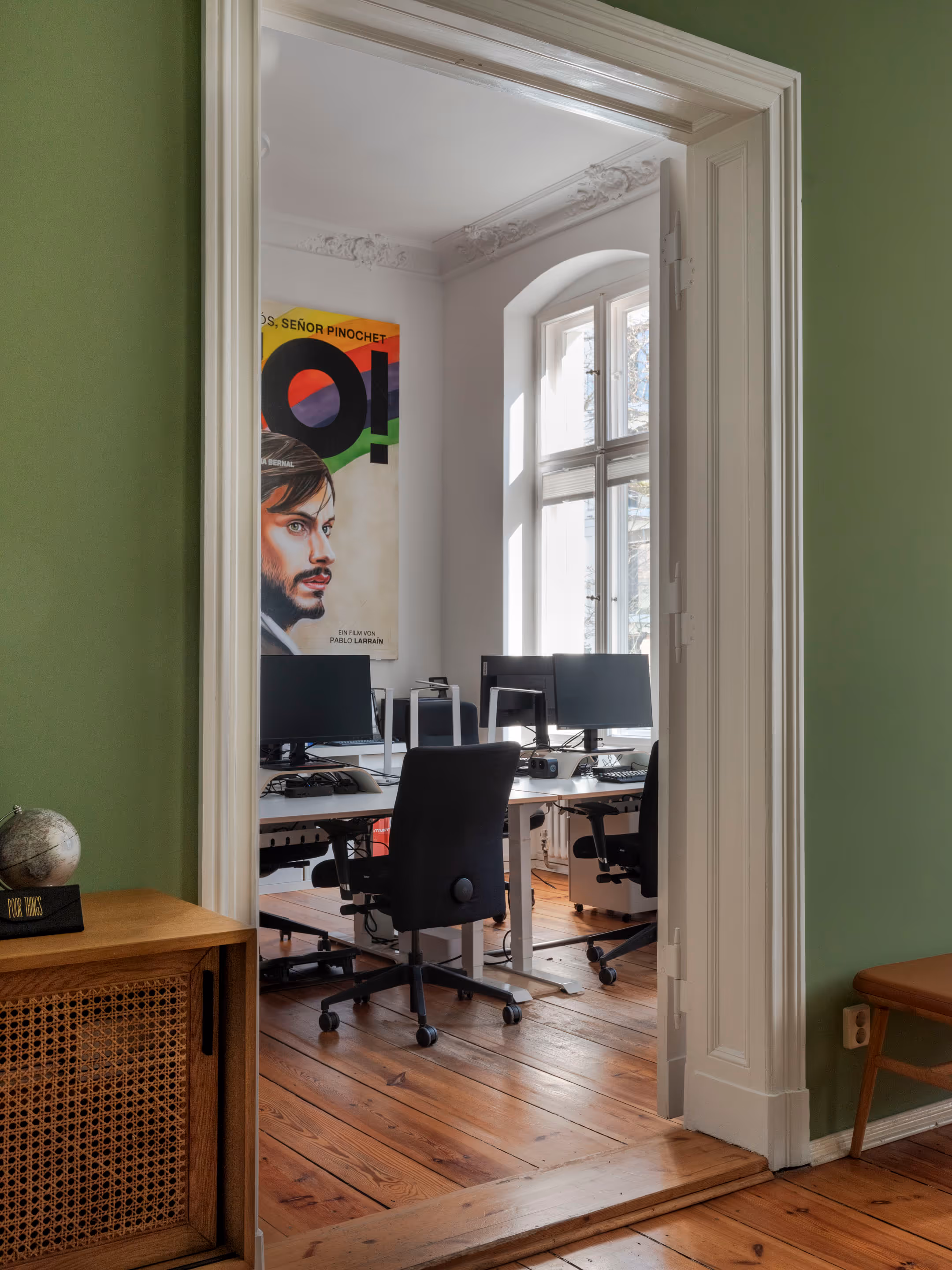 In contrast, the surrounding employees' rooms and meetings' room adiate elegant sophistication. Immaculately white, these spaces provide a clean canvas for the film posters that decorate the walls. These bold painted film posters inject splashes of colour and energy, reflecting the dynamic spirit of Berlin's film scene.